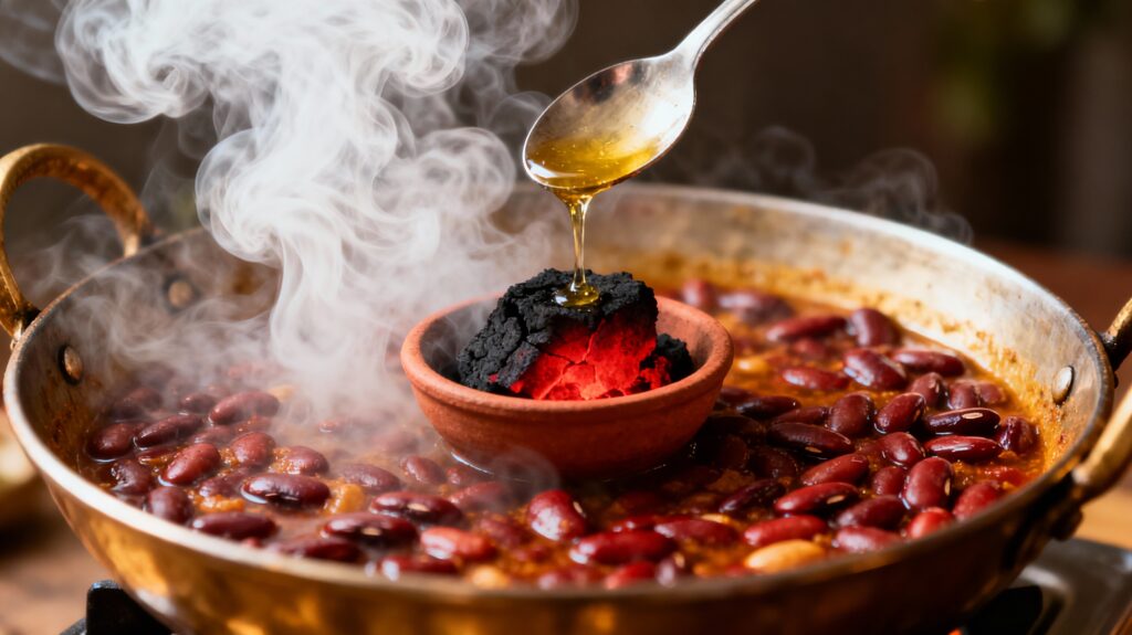 यह ढाबों का सबसे बड़ा राज़ है। ढाबे कोयले की आँच पर पकाते हैं, जिससे राजमा को खास धुँआदार खुशबू मिलती है। आप घर पर भी ‘धुँगर’ तकनीक से वही स्वाद ला सकते हैं। यही आपकी Rajma Chawal Recipe को खास बनाएगा।