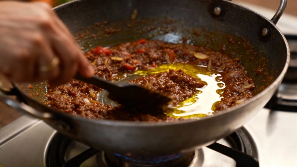 इस मिश्रण को बीच-बीच में चलाते हुए तब तक पकाएँ जब तक मसाले से घी अलग होने न लगे और यह गाढ़ा, सुगंधित पेस्ट ना बन जाए। रंग भी गहरा हो जाएगा — धैर्य रखें!